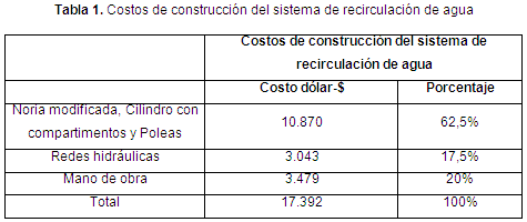 En la Tabla 1 se discriminan los costos de construcción del sistema de recirculación de agua, como se ha descrito anteriormente. Los costos se han dividido en costos de construcción y mano de obra. Para la instalación se debe considerar una persona capacitada de apoyo a los trabajadores no cualificados. Los costos de ingeniería para la asesoría hidráulica no están incluidos. Los costos de materiales se indican en dólares. Se considera una vida útil calculada de 30 años, con un mantenimiento anual de $150 dólares, puede trabajar 24 horas durante los 365 días del año y no posee consumo de energía eléctrica.