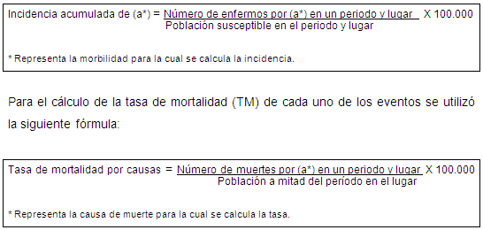 En la construcción de la incidencia y de la tasa de mortalidad se utilizó como denominador la media de la población de cada municipio para el período según reporte del Departamento Nacional de Estadística. Todas las tasas fueron calculadas usando una constante de 100.000 habitantes.