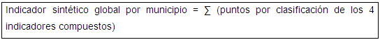 Una vez determinados los indicadores de la Fase 3 se clasificaron los municipios en tres categorías (baja, media y alta) en cada uno de los indicadores sintéticos, la clasificación se realizó mediante los percentiles 33,3 y 66,3. Una vez clasificados los municipios se reasignó un nuevo valor a cada municipio, según la categoría en la que habían sido clasificados, de la siguiente manera: baja: 33, media: 66, alta: 100.
