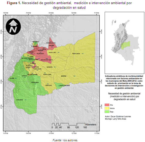 Abstract: Objective: To build a synthetic indicator based on health degradation in the municipalities of the Department of Meta in the period 2009-2012 to enable prioritizing research needs and environmental intervention in these municipalities. Methodology: An analytical, observational, exploratory, retrospective study was carried out. Data were obtained from the state public health surveillance databases and the unified affiliated record (UAR), in the period 2009-2012 in the Department of Meta. Once the cases for analysis were selected, new databases were created which were analyzed in 4 stages: construction of simple indicators; thematic indexes; composite indicators, and the overall synthetic indicator. Results: The indicator showed a value for each of the 29 municipalities, making clear differences in environmental effects on health. San Carlos de Guaroa with the highest score (10,200) and Puerto Concordia (1,000). By stratifying the indicator, municipalities classified as: high need, average requirement, and low need. Discussion: Considering health as an indicator of the state of the environment and the environment as a determinant causal of health has generated the development of different methodologies to measure the cause-effect relationship between environment and health. The presence of environmental factors which trigger morbimortality, recognized by the World Health Organization (WHO) as a driving force, pressure or exposure in the causation of environmental origin (Yassi et al., 2002; Posada et al., 2004), responsible for different behaviors in health degradation is concluded. Conclusions: The indicator allows measuring environmental differences between municipalities, and the differences in the effects of environment on health, as well as inferring the environmental conditions of the municipalities buy observing the presence of effects from: water, air, chemical substances, and fauna.