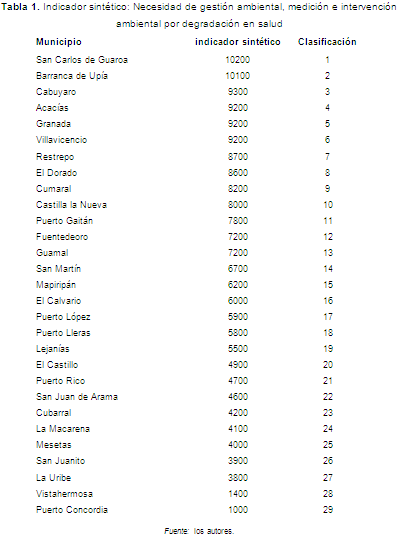 En la clasificación se observan los 10 municipios con el puntaje más alto obtenido por degradación en salud por efecto de variables ambientales, en orden descendente fueron: San Carlos de Guaroa, Barranca de Upía, Cabuyaro, Acacías, Granada, Villavicencio, Restrepo, El Dorado, Cumaral, Castilla la Nueva, Puerto Gaitán. Debe tenerse en cuenta que todos los municipios presentan degradación en salud por factores ambientales.