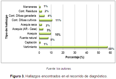 Inicialmente se establece como uno de los principales resultados la identificación de 92 puntos correspondientes a los diferentes usos del recurso (Figura 3), que permite establecer que el uso prioritario y de mayor impacto es la descarga de aguas residuales o vertimientos en la fuente con un porcentaje de 58%; se debe, fundamentalmente, a que las familias no poseen un sistema de tratamiento de aguas residuales; por lo cual, se descarga directamente al río, esto repercute en las condiciones de calidad, tanto del río El Encano como de la laguna de La Cocha, de la cual es afluente.