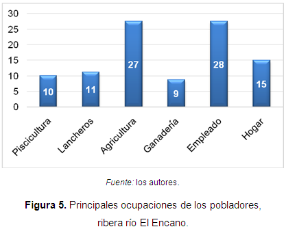 Por otra parte, se pudieron establecer las diferentes actividades a las cuales se dedica la población de estudio (Figura 5), dentro de las cuales sobresal en la actividad agrícola con un 27%,como una de las de mayor desarrollo, debido a que culturalmente la comunidad ha heredado dicha actividad, sumado al gran potencial ecosistémico que el área ofrece con suelos aptos para el cultivo de diferentes productos; asimismo, se observó que por la dificultad de oferta laboral en la zona muchos de sus habitantes se han visto en la necesidad de buscar trabajo en el área urbana, y los que consiguen trabajo dentro de su territorio se emplean como jornaleros para trabajar la tierra (28%); no obstante, dado que este humedal Ramsar tiene un enorme potencial turístico, el 11% de la población con cierto nivel de estudios se dedica a esta actividad, transportando a los turistas a lo largo de la laguna en lanchas artesanales.