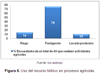 Respecto a los usos del agua (Figura 6), se consideró importante determinar las actividades en las cuales se usaba mayor cantidad de agua del río El Encano, estableciendo que el 76% de la población encuestada hace uso del recurso hídrico para la fumigación de cultivos como papa, fresa y hortalizas, entre otros; el 10% la destina para las actividades de riego, y el 10% restante hace uso del recurso para lavar los diferentes productos agrícolas sembrados y cosechados en la zona. Es de importancia denotar, que de esta fuente no se extrae agua con fines de consumo humano, ya que sus condiciones de calidad no cumplen con los criterios para dicho uso.