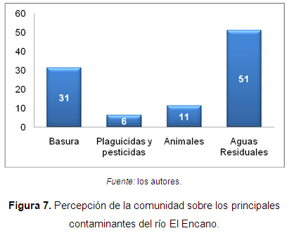 Otro de los aspectos que fueron considerados dentro del estudio, es la identificación de los principales contaminantes que se encuentran afectando las condiciones fisicoquímicas del río (Figura 7), a lo cual se pudo establecer que el 51% de la población encuestada descarga las aguas domiciliarias al río, el 31% deposita los residuos sólidos directamente en el río, el 11% de la población permite que los animales permanezcan cerca de la fuente, lo que genera contaminación por materia orgánica, y el 6% restante de la población considera que la contaminación se debe a la actividad agrícola, por la utilización de plaguicidas y pesticidas necesarios para mantener la cantidad de la producción en la zona.