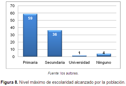 No obstante, es importante resaltar que todas estas actividades generan deterioro del recurso hídrico que afecta tanto a la población como al ecosistema, considerado a este último como uno más de los usuarios. El proceso de deterioro o conservación de los recursos naturales, y especialmente del recurso hídrico, se ve influenciado por la educación ambiental de los usuarios, este aspecto se convierte en uno de los más débiles debido a que el 59% de la población ha alcanzado únicamente el nivel de básica primaria, el 36% el de básica secundaria, únicamente el 1% el nivel universitario y el 4% no ha recibido ningún tipo de educación (Figura 8); situación que afecta no solo las condiciones de calidad de la población, dado que incrementa la dificultad para la población de competir en el mundo laboral, y el desconocimiento de los aspectos ambientales impide desarrollar prácticas de uso y manejo de los recursos naturales más adecuadas.