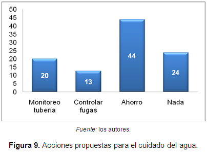 Finalmente, la comunidad identificó las opciones más propicias que contribuyen a desarrollar procesos de uso y manejo más sostenibles tanto para la comunidad como para el ecosistema (Figura 9), en donde el 44% de la población consideró que el ahorro de agua es la actividad más importante para mejorar los procesos de conservación del recurso hídrico, el 20% propone la necesidad de establecer sistemas de monitoreo que implementen medidores que reduzcan el desperdicio del agua y que obligue a la comunidad a ahorrar el recurso; para el 13% de la población es importante el control de las fugas de agua, ya que en muchos casos las instalaciones para obtener dicho recurso se construyen artesanalmente; por su parte, el 24% de la población considera que no es necesario desarrollar ninguna actividad, ya por el momento no presentan ningún inconveniente en cuanto a su salud y disponibilidad del recurso. Esta situación demuestra con claridad la urgencia de promover y fortalecer procesos de educación ambiental en la comunidad, así como también el sentido de pertenencia para contribuir a optimizar y conservar todo el potencial ambiental de este ecosistema.