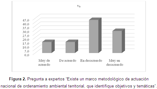 "En Colombia se ha adoptado un criterio cada vez más dinámico para el establecimiento de objetivos de política ambiental internacional y se ha incorporado el medio ambiente en la estrategia de cooperación internacional del país", (Cepal, 2014. P.112) por otro lado, se han formulado políticas en diferentes áreas y con diversos enfoques y propósitos sobre el territorio, sumadas a los espacios de ordenamientos sectoriales (minero energéticos, viales, agrícola, entre otros), a través de decisiones que afectan el uso del suelo y las condiciones ambientales, tales como los proyectos de interés nacional, los derivados de las denominadas locomotoras del desarrollo o megaproyectos de infraestructura o productivos. Esto se traduce en desarticulación institucional en el territorio del municipio de Turbo, con multiplicidad de instrumentos de planeación, sin capacidad de armonización, desarticulación municipal entre los procesos de ordenamiento territorial y los derivados de la gestión ambiental. De allí que el 42,9% de los expertos consultados manifestaron estar "en desacuerdo" y el 28,6% "muy en desacuerdo", cuando se les consultó la premisa "Existe un marco metodológico de actuación nacional de ordenamiento ambiental territorial, que identifique objetivos y temáticas en el municipio de Turbo" (Figura 2 )