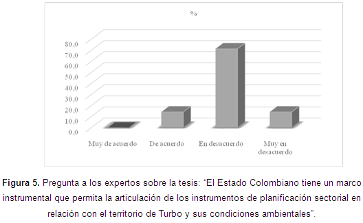 De allí que el 71,4% de los expertos consultados indican estar en "desacuerdo" con la tesis: "El Estado Colombiano tiene un marco instrumental que permita la articulación de los instrumentos de planificación sectorial en relación con el territorio de Turbo y sus condiciones ambientales" (Figura 5 )