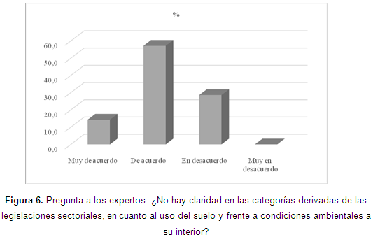 Ahora bien, las políticas ambientales generadas por las autoridades del Sistema Nacional Ambiental y las formuladas por los sectores agropecuarios carecen de un enfoque territorial que reconozca las condiciones ambientales y las diferencias territoriales de las regiones del país y en concreto del municipio de Turbo, por lo cual los expertos al preguntárseles si "No hay claridad en las categorías derivadas de las legislaciones sectoriales, en cuanto al uso del suelo y frente a condiciones ambientales a su interior", el 57% respondió "estar de acuerdo" con la apreciación y el 14% indicó estar "muy de acuerdo" (Figura 6