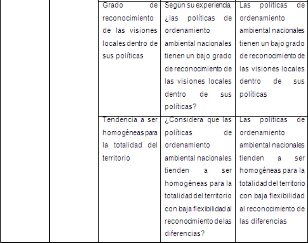 Complementariamente a lo anterior, se evidencia que no existe un marco metodológico de actuación nacional, que identifique objetivos y temáticas concretas sobre las cuales actuar, dependiendo del tipo de situación a resolver en cada una de las escalas territoriales. Apreciación que es corroborada por los expertos, los cuales en un 71,4% responden que no hay claridad en las categorías derivadas de las legislaciones sectoriales, en cuanto al uso del suelo y frente a condiciones ambientales a su interior, e igualmente en un 85,7% los expertos manifiestan que las políticas de ordenamiento ambiental nacionales tienen un bajo grado de reconocimiento de las visiones locales, lo que genera conflictos en el territorio de Turbo.
