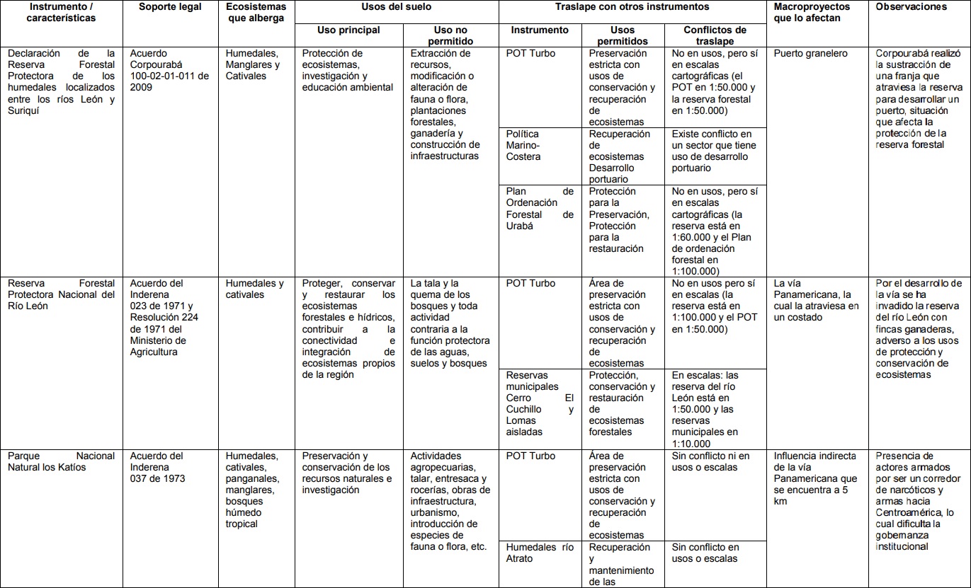 Como caso típico de la desarticulación de política, se tiene a la Ley 388 de1997 (Congreso de Colombia, 1997), la cual plantea que las determinantes ambientales para los planes de ordenamiento territorial municipal deben centrar sus definiciones en las normas de superior jerarquía, pero no hay claridad en la definición de otros tipos de variables (por fuera de las normas de superior jerarquía), que pueden ser parte de las determinantes ambientales y que jueguen un papel importante a nivel municipal, presentándose una amplia diversidad de criterios en las Corporaciones Autónomas Regionales y dificultades en los procesos de concertación ambiental entre los municipios y las CARs, situación que evidentemente desarmoniza aún más la aplicación de política nacional colombiana en los casos concretos a nivel local. En la siguiente tabla se hace un análisis de la articulación de los instrumentos de ordenamiento ambiental del municipio de Turbo considerando entre otros los soportes legales, los ecosistemas que alberga, los macroproyectos que afectan y el traslape con otros instrumentos: