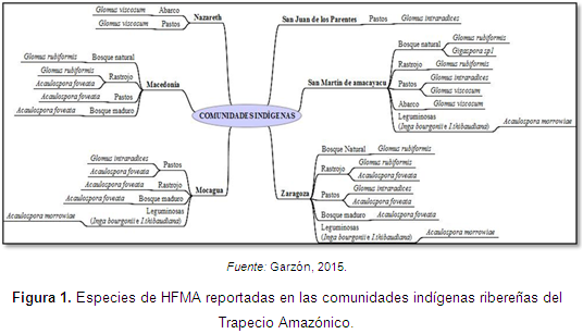 Mas especificamente, Peña-Venegas et al. (2006) encontraron que en los suelos de las comunidades ribereñas del Trapecio Amazónico (San Juan de los Parentes, Nazareth, Macedonia, Mocagua, Zaragoza y San Martín de Amacayacu) hay presencia de especies de hongos formadores de micorrizas arbusculares asociados a distintas coberturas vegetales (Figura 1).