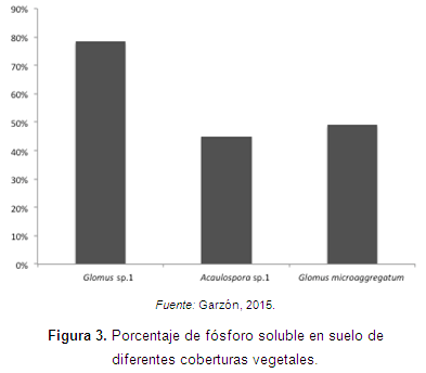 Peña-Venegas et al. (2007) evaluaron la relación de las esporas de hongos glomales con las características físicas, químicas y biológicas del suelo de distintos tipos de vegetación del sur de la Amazonia. En este estudio se encontraron 18 morfotipos de esporas de HFMA diferentes: 11 especies de Glomus, 4 especies de Acaulospora, y una especie de Archaeospora, Scutellospora y Gigaspora. La presencia de fósforo soluble indicó que los suelos bajo rastrojo presentaron la mayor concentración media, valor que fue estadísticamente igual al encontrado para los suelos con cobertura boscosa, pero significativamente diferente al valor estimado para los suelos de pradera (Figura 2).