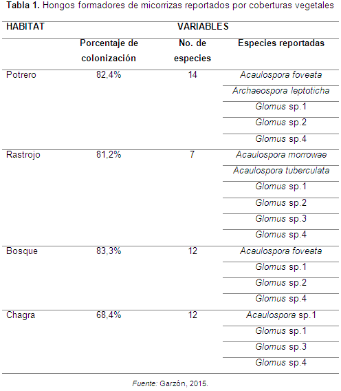 Peña-Venegas y Arias (2009) evaluaron el nivel de colonización de raíces con HFMA nativos en especies de leguminosas ubicadas en potreros, chagras, rastrojo y bosques. Encontraron que las muestras colectadas en potreros, rastrojo y bosques tenían un mayor porcentaje de colonización que las obtenidas en las chagras, lo que indicó que hay una mayor presencia de micorrizas en áreas naturales no intervenidas (ver Tabla 1).