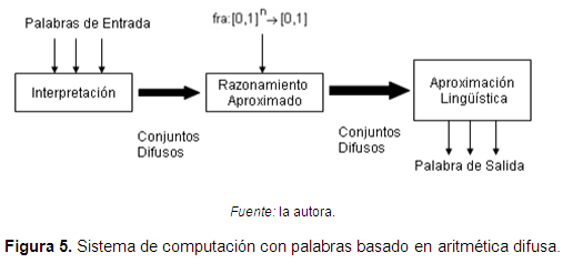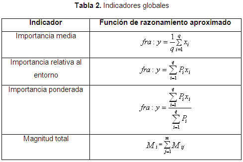 • La utilización de sistemas de computación con palabras basados en aritmética difusa (Duarte, 2000; Duarte et al., 2007) para calcular los indicadores de Importancia y Magnitud de la metodología. La Figura 5 muestra la arquitectura básica de estos sistemas, y en la Tabla 2 se muestran algunos de los indicadores que se pueden calcular con estos sistemas y sus funciones de razonamiento aproximado (fra).