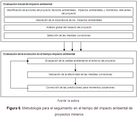 En este artículo se describe una metodología para la evaluación de impacto ambiental para proyectos mineros utilizando técnicas difusas, la cual permite realizar el seguimiento en el tiempo del impacto ambiental. Esta metodología tiene la finalidad expresa de conocer el estado del Medio Ambiente en momentos futuros, comprobar la efectividad de las medidas correctoras y valorar la necesidad de realizar cambios al proyecto, en determinados momentos prefijados del desarrollo de la actividad.