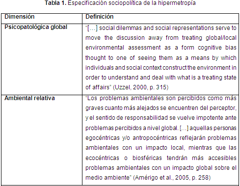 En Psicología de la Sustentabilidad, la hipermetropía, en su concepción general, supone percepciones sesgadas relativas al impacto de catástrofes ambientales y desastres naturales derivados del cambio climático que son apreciados por la sociedad como eventos aislados que no repercutirían ni directa, ni indirectamente en la calidad de vida, el confort residencial y el bienestar subjetivo (véase Tabla 1 en Anexo).