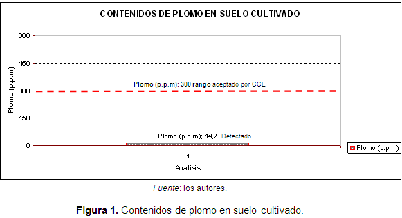 Rubio et al. (2004) afirman que en suelos cultivados pueden llegar a encontrarse valores de plomo por encima de 360 mg/kg. A pesar de lo anterior, los contenidos de plomo obtenidos en las muestras de suelo examinadas bajo el método de análisis ISO-466 NPC 38-88 arrojaron un valor de 14,7 ppm (ver Figura 1) que, al ser comparado con la norma 86/278 de la Comunidad Económica Europea (1986), el valor obtenido en el contenido de este metal específico es mínimo y no presenta incidencia negativa en el suelo; ya que lo establecido por la normativa presenta un valor de 300 ppm dentro del rango aceptable.