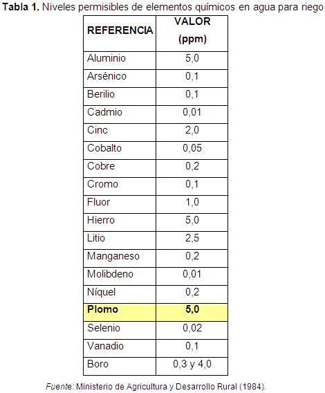 El ser analizada el agua para riego utilizada en la presente investigación, se obtuvieron valores de 0 ppm de plomo (no detectado) según método Pb (lectura A.A).