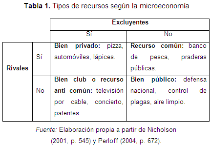 Conforme la Tabla 1 , y conforme la perspectiva microeconómica, los recursos presentes en la realidad pueden agruparse y definirse a partir de dos características independientes, (i) la posibilidad o no de exclusión, y (ii) la posibilidad o no de rivalidad. En este orden, […] un bien resulta excluible cuando es posible impedir que lo utilice una persona […] [y] es rival cuando su uso por parte de una persona reduce [altera] su uso por parte de otra" (Mankiw, 1998, p. 142) 20 . A contrario sensu, un recurso resulta no excluible cuando no es posible evitar que otra persona también lo consuma, y no es rival cuando la "oferta es conjunta", esto último "[cuando] el consumo del mismo [recurso] por una persona no reduce la cantidad disponible para cualquier otra" (Hardin, 1991, p. 83).