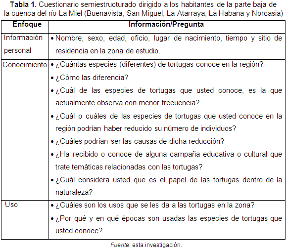 Las encuestas fueron aplicadas entre mayo y septiembre de 2014, con el objetivo de establecer el conocimiento acerca de la distribución, hábitat, alimentación, reproducción de las tortugas; así como su uso, bajo tres criterios (consumo, comercio y mascotas). Se aplicaron 101 encuestas en cuatro puntos considerados "estratégicos" (asentamientos humanos con mayor influencia o dependencia económica del río La Miel). Los lugares seleccionados incluyeron personas de La Habana (n = 17), Norcasia (n = 27), La Atarraya (n = 16), Buenavista (n = 21) y San Miguel (n = 20). A los participantes, se les mostraron imágenes de las tortugas reportadas para el lugar, antes de resolver las preguntas, con la intención de evitar sesgos en las respuestas relacionadas con el nombre común y rasgos descriptivos de las especies. Los aspectos relacionados con la biología, distribución y amenazas de estas especies, fueron contrastados y complementados con la información documentada para el país por Rueda-Almonacid et al. (2007) y Paéz et al. (2012).