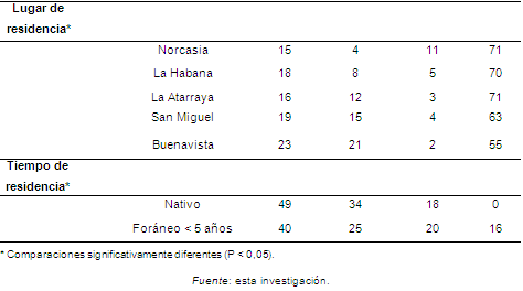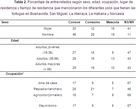 El conocimiento acerca del uso de las tortugas fue significativamente diferente en relación con el oficio de los encuestados (Prueba Exacta de Fisher, P = 0,009), siendo los agricultores/jornaleros y los mayordomos las personas que menos reconocen los usos que se les da a las tortugas. Asimismo, se detectaron diferencias con respecto a las localidades (Prueba Exacta de Fisher, P < 0,001); en particular, en La Habana y Norcasia es donde los encuestados conocen muy poco acerca de los usos que se les da a las tortugas tabla 2 .