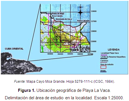 Playa La Vaca está ubicada aproximadamente a 3 km al noroeste de la ciudad de Moa en la costa norte de la provincia de Holguín (Cuba), limitando al norte y al este con el océano Atlántico, al sur con la ciudad de Moa, y al oeste con las localidades de Yaguaneque y Cananova [Mapa Cayo Moa Grande Esc: 1:25000. Hoja cartográfica 5278-111-c (ICGC, 1984)] (figura 1).