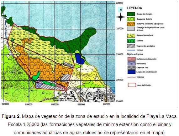 En Playa la Vaca se verificó que existen las siguientes formaciones vegetales naturales: bosque de pinos, bosque de galería, bosque de mangles, matorral xeromorfo sub-espinoso sobre serpentina (charrascal), complejo de vegetación de costa arenosa; comunidades acuáticas de aguas dulces y formaciones vegetales secundarias que se establecen por la alteración de la vegetación natural: sabana seminatural, matorrales secundarios, cultivos y vegetación segetal. El área que fue seleccionada como zona de estudio incluye las formaciones mencionadas a excepción del Pinar pues esta formación vegetal fue prácticamente destruida por la explotación forestal desde la década de 1940 (Leyva, 2005, com. pers.; Cabreja, 2006, com. pers.) (figura 2). También, se debe aclarar que la formación natural de comunidades acuáticas no fue delimitada en el mapa de vegetación, ya que esta se forma temporalmente en época de lluvias en las zonas más bajas de la sabana seminatural.
