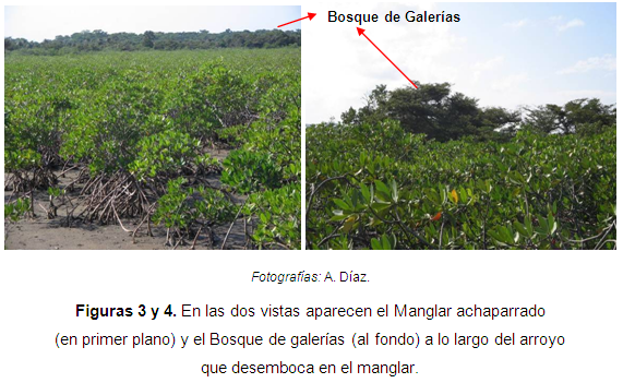 1. Manglar monoespecífico achaparrado con poca altura: predominan los individuos de Rhizophora mangle L. con poco diámetro de tronco y una altura de 1-2 m, la cobertura es poco densa y tiene un aspecto achaparrado. Esta variante, predomina en la mayoría del área de estudio (zonas de mayor intercambio de la marea y en las zonas más bajas) y ha recibido afectaciones producto de la acción del hombre; entre ellos el azolve y la contaminación química que arrastran los ríos desde las zonas de minería y la pesca ilegal.