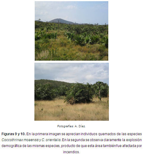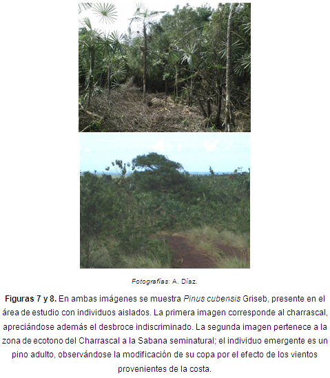 Estas formaciones vegetales no conservan sus condiciones naturales originales por el manejo inadecuado que han recibido los diferentes ecosistemas; en algunas zonas del área las formaciones vegetales han llegado a transformarse de manera drástica. Esto se puede apreciar en la zona más alta del área; en la cual, según testimonio de los pobladores, existía un pequeño cayo de Pinar que fue explotado desde el siglo pasado por la compañía maderera que operaba en Moa en 1940; en la actualidad aún existen individuos de Pinus cubensis Griseb. dispersos (figura 7 y 8). En la parte baja de la llamada Playa La Vaca, que no es más que las sabanas de Playa La Vaca mencionada en las colectas de diferentes botánicos que han visitado el lugar, el charrascal se extendía más hacia la costa y debido a las afectaciones recibidas durante años, entre ellas el incendio como el más agresivo, trajo consigo que la pequeña área que existía de forma natural de sabana se desarrolló, ganando en extensión hacia el sur (Leyva, 2005, com. pers.; Cabreja, 2006, com. pers.).