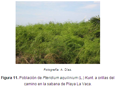 Pteridium aquilinium (L.) Kunt., perteneciente al estrato herbáceo se destaca como especie intrapófita pionera, observándose a las orillas del camino numerosas poblaciones que en ocasiones impiden el paso (figura 11). Este fenómeno también se aprecia en las especies Coccothrinax moaensis (Borhidi & O. Muñiz) O. Muñiz y C. orientalis (León) O. Muñiz & Borhidi; en las cuales ha ocurrido una explosión en su crecimiento tornándose expansivas, favorecidas por la quema repetida, constituyendo esto una amenaza para la regeneración natural del área.