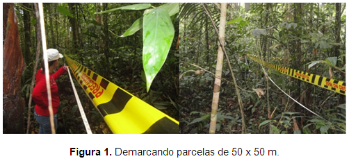 Tamaño: Se estableció un área efectiva de 1,5 ha, con 6 parcelas de 50 x 50 m. Pinelo (2000) recomienda que las parcelas permanentes de medición (PPM) en el bosque tropical tengan una forma cuadrada debido al menor perímetro con respecto a parcelas rectangulares y con un área de 0,25 ha.
