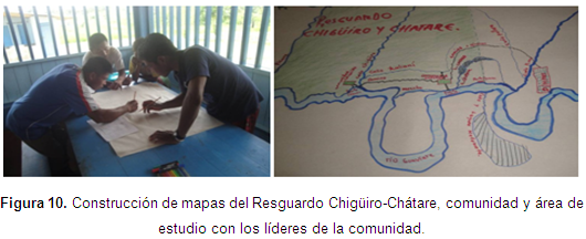 Cartografía social: Empleando la herramienta de cartografía social de Rodríguez et al. (1999) se elaboraron los mapas del departamento para ubicar el corregimiento de Barrancominas, posteriormente en otro mapa a mayor detalle ubicar el Resguardo Chigüiro-Chátare y finalmente la zona de estudio, también se determinaron las especies de importancia para la comunidad y el área de muestreo, siempre con el apoyo de los líderes de la comunidad: el Capitán, el Líder, el Pastor, el ExCapitán y el Director de la Escuela Agapito Sandoval.