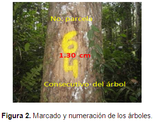 b) Marcado: Para efectos de una mejor identificación en el campo, cada árbol fue marcado con pintura amarilla brillante, utilizando para ello dos números: arriba el número de la parcela y abajo el número consecutivo del árbol, los cuales fueron anotados en el formulario.
