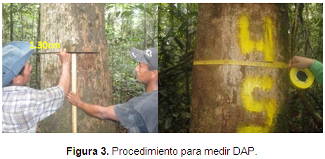 Se midió en una parte libre de daños y defectos, con ayuda de una baliza de 1,30 m de longitud. Ante la presencia de musgos y lianas en algunos árboles fue necesario retirarlos con el objetivo de no afectar la medida que se registró.