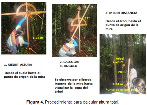 Altura total: Debido a las limitaciones del estudio y a la carencia de hipsómetros, se realizó una estimación usando el fundamento trigonométrico Blume-Leiss (Domínguez, 2010), y se acudió también a la ayuda de guías locales con experiencia en estas mediciones en cada una de las parcelas. Esta altura se estimó desde el suelo hasta la cima de la copa de cada individuo (Vallejo et al., 2005).
