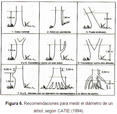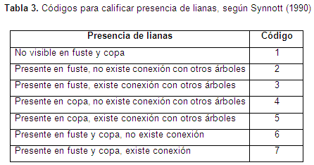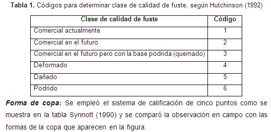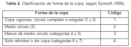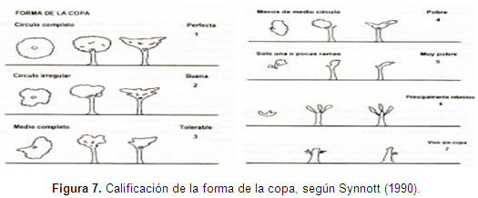 Forma de copa: Se empleó el sistema de calificación de cinco puntos como se muestra en la tabla 2Synnott (1990) y se comparó la observación en campo con las formas de la copa que aparecen en la figura 7.