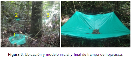 Las trampas se dejaron instaladas por un periodo de 15 días, al cabo de los cuales se recolectó el material de las estructuras no renovables (Salas e Infante, 2006). En vista de la escasa hojarasca colectada con las primeras trampas se optó por ampliar dicho diámetro usando lona, esta vez se colocaron dos trampas por árbol (mismos árboles de la primera colecta) con una dimensión de 2 m x 2 m.