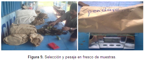 Las muestras recolectadas se seleccionaron, pesaron en fresco y se guardaron en bolsas de papel con aireación suficiente para presecarlas y evitar la pérdida por descomposición, luego fueron nuevamente pesadas y se almacenaron para llevarlas a los procedimientos de laboratorio.