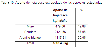 Para el caso de este estudio se observa que el Pendare es la especie con mayor aporte de biomasa foliar (59,57%), seguida del Arenillo blanco con 27,48% y finalmente el Mure con 14,39%.