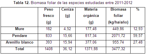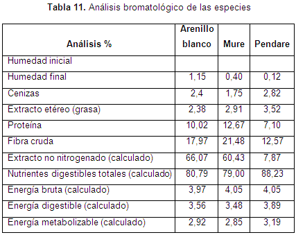 La tabla 12 muestra el análisis que se le hizo al componente foliar de las especies estudiadas, donde se observa que las 3 representan un alto porcentaje en nutrientes digestibles, extracto no nitrogenado, fibra cruda y proteína que si bien esta parte de la planta no es de consumo humano sí es de gran importancia para la herviboría (insectos, aves, entre otros) que habita en el lugar. La grasa, la energía se encuentran en menor porcentaje sin que esto represente menos importancia para los organismos que la consumen. La ceniza es el componente con el cual se calcula la biomasa foliar, parte de uno de los objetivos presentados en el proyecto.