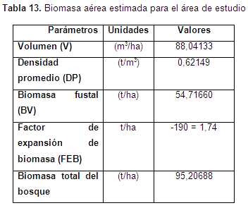 Los datos obtenidos se presentan en la tabla 13 [estimación de biomasa con ecuación de Brown (1997) para un área de bosque primario].
