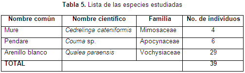 En el área de muestreo, 2500 m² distribuidos en 6 parcelas de 50 x 50 m², se levantaron todos los árboles pertenecientes a las especies Mure, Pendare y Arenillo blanco con DAP mayor a 20 cm, encontrándose un número total de 39 árboles.