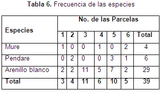 La tabla 6 muestra las especies presentes en cada parcela, se evidencia que el Arenillo blanco está presente en todas las parcelas y que para el caso del Mure y el Pendare solo se encuentran en el 50% de las parcelas estudiadas.