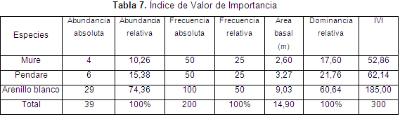 La tabla 7 muestra, según el Índice de Valor Importancia (IVI), que el Arenillo blanco es la especie de mayor importancia ecológica en el área de estudio, lo cual se sustenta al observar los valores de abundancia, frecuencia y dominancia relativos. Le sigue en orden de importancia el Pendare y finalmente el Mure.