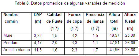 La tabla 8 muestra que las especies estudiadas presentan buena calidad fitosanitaria y un alto potencial para produccion de madera; los valores del Mure y el Arenillo blanco indican que los árboles estudiados son comerciales en la actualidad, para el caso del Pendare el valor refleja que es comercial a futuro.