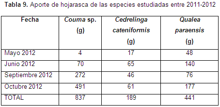 El mayor aporte en la producción de hojarasca del bosque corresponde a la especie Couma sp., el mayor aporte ocurrió en el mes de octubre de 2012, 491 g correspondientes al 67,35% de la hojarasca total colectada en este mes. La época de mayor caída de hojas ocurrió en el mes de octubre con 728 g (49,69%) y septiembre 394 g (26,85%), los meses corresponden a época de invierno en la zona.
