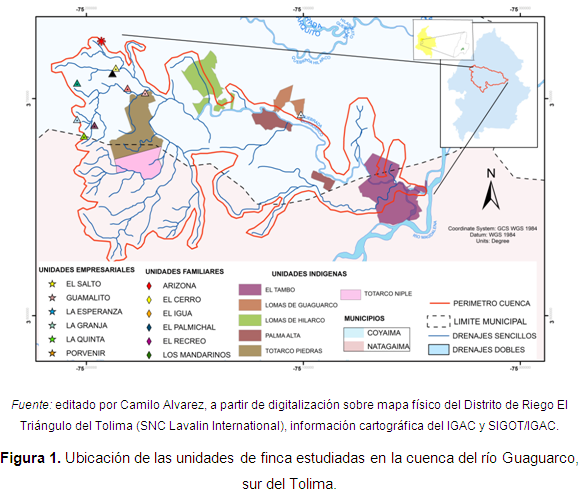 El estudio se realizó en la cuenca del río Guaguarco, localizada entre los municipios de Coyaima y Natagaima al sur del departamento del Tolima sobre el flanco derecho de la cordillera Central Colombiana. Fueron seleccionados 18 "sistemas de finca" 2 representativos de cada uno de las tres principales formas de agricultura en la cuenca: 6 unidades indígenas (UI), 6 unidades familiares (UF) y 6 unidades empresariales (UE), seleccionados de acuerdo a la forma de tenencia de la tierra, estructura del sistema (cultivo predominante), operación del mismo (tipo de mano de obra empleada) y destino de la producción (Figura 1).