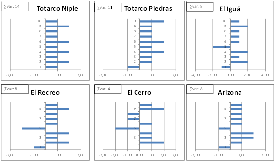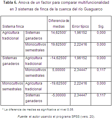 Los promedios de ∑var destacan los sistemas agrícolas tradicionales como multifuncionales (8,63), seguidos de los sistemas ganaderos (-6,00) y por último el conglomerado de sistemas de monocultivo semestral (-11,00); mientras que el análisis estadístico de varianza para un factor reporta diferencias entre los sistemas de agricultura tradicional con los ganaderos y los de monocultivos semestrales, pero no se reporta diferencia significativa para la comparación entre las ∑var para los sistemas ganaderos y sistemas de monocultivos semestrales (tabla 6).
